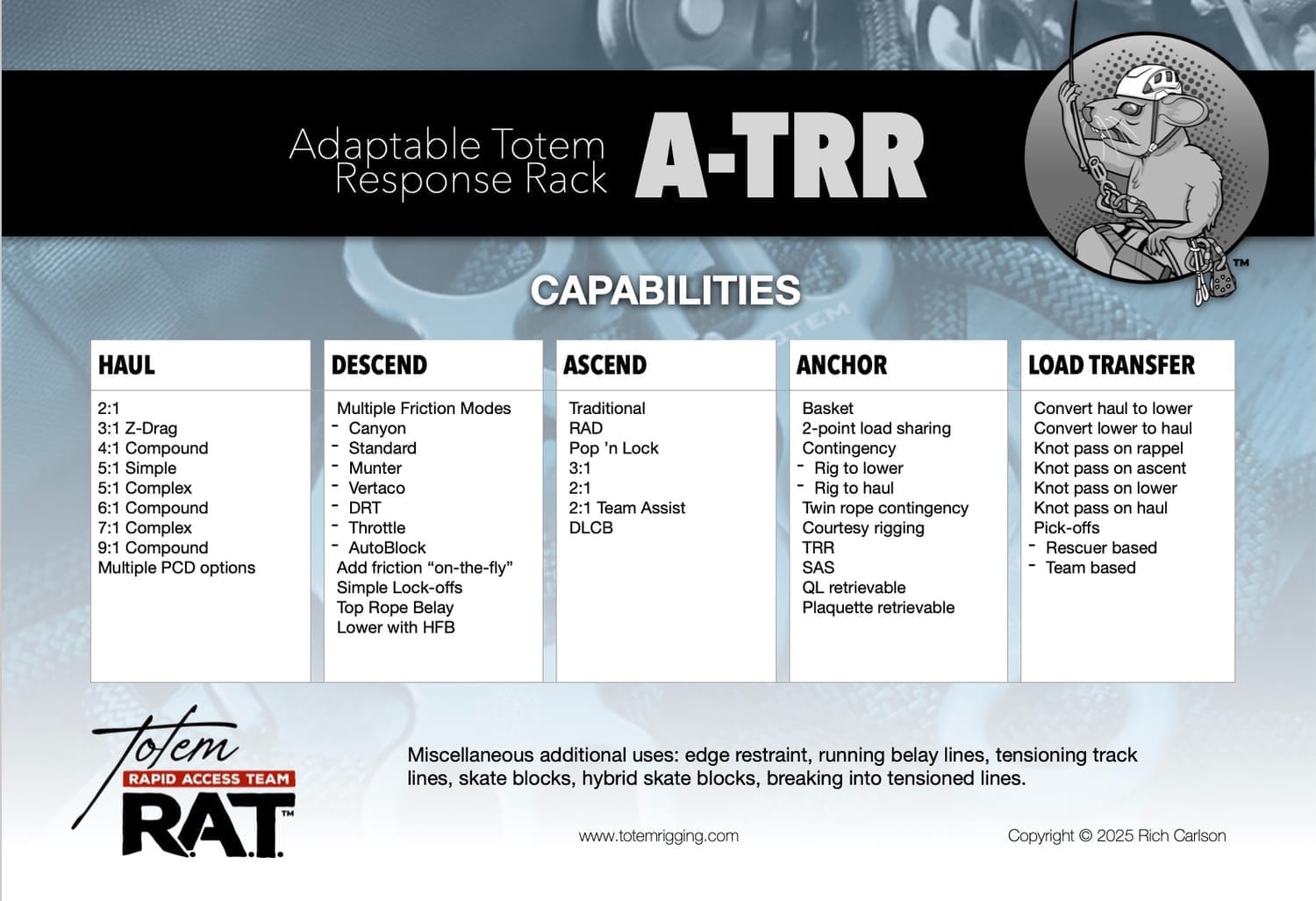 Our A-TRR is similar, but includes items that are compatible with the systems and techniques we have been teaching in our rescue, rigging and rappelling courses over the years.